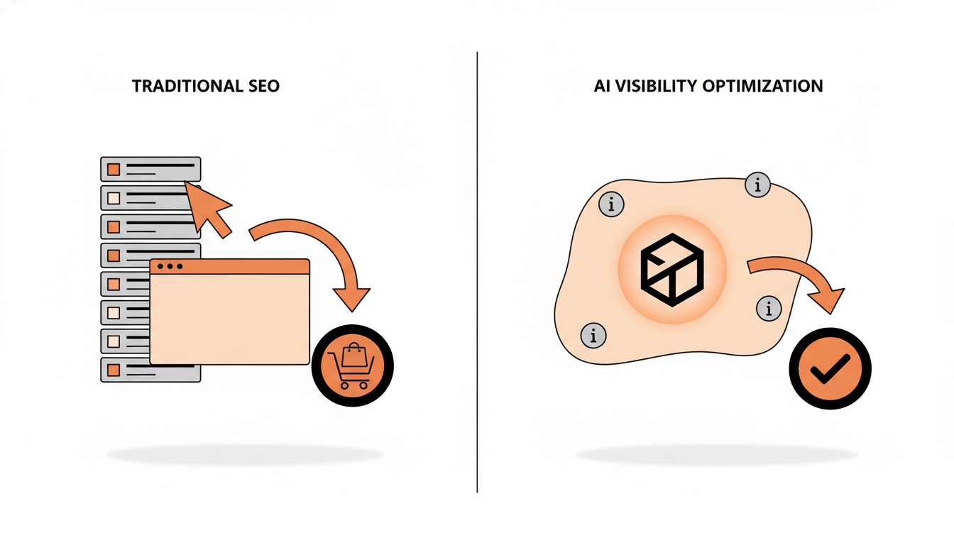 Traditional SEO targets rankings and clicks. AI visibility optimization targets citations and mentions in AI-generated answers. The goal is brand presence in zero-click surfaces where users never visit your site.